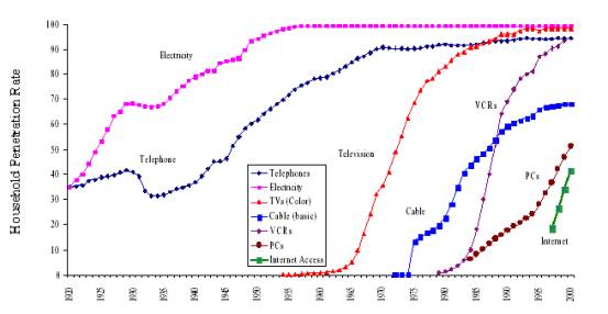 Рисунок 2 показывает, что новые технологии распространяются быстрее, чем в прошлом. Двигателем распространения данных технологий является снижение их стоимости, которое порождается конкуренцией между фирмами, желающими привлечь новых пользователей по мере насыщения категорий населения с более высокими доходами. Так, в США с 1984 по 1999 количество пользователей мобильных телефонов возросло со 100 тысяч до 100 миллионов. При этом, средняя стоимость услуг упала с 2000$ до 180$ при возросшем качестве услуг. В случае, если бы правительство изначально компенсировало компаниям убытки от оказания услуг мобильной связи наименее платежеспособным клиентам, компании не имели бы значительного стимула к снижению издержек, как это и происходит во всех случаях применения затратного ценообразования, широко практикующегося в регулировании естественных монополий и приводящего к консервации существующих технологий и структуры издержек.